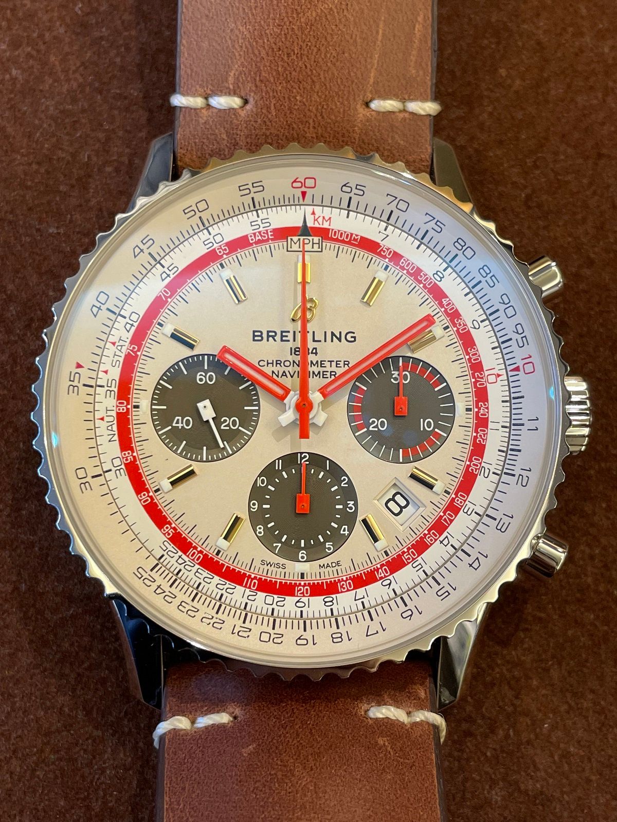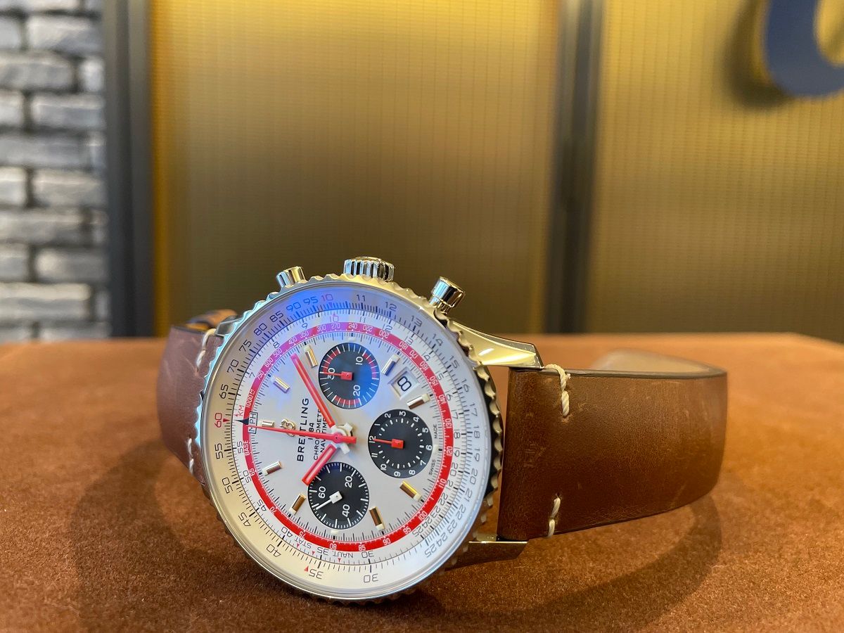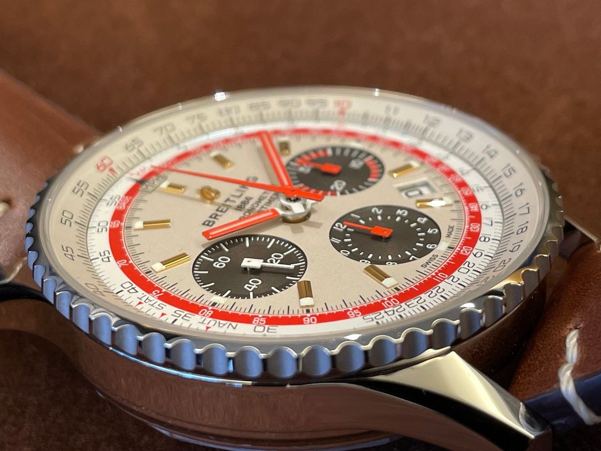 文字盤に特徴のあるこのナビタイマー、ある航空会社をイメージした特別なモデルとなっています!