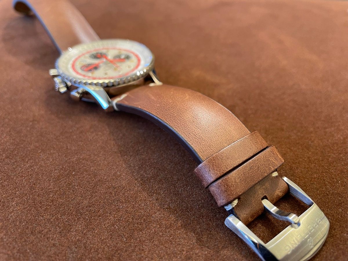 ヴィンテージ感漂うブラウンのカーフスキンレザーも、時計全体を引き立てるキーアイテムとなっています。