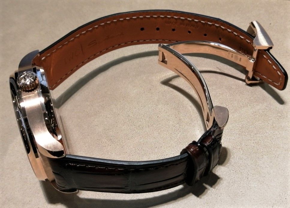留め具がピンバックルではなくフォールディングバックル。しかもゴールド製。