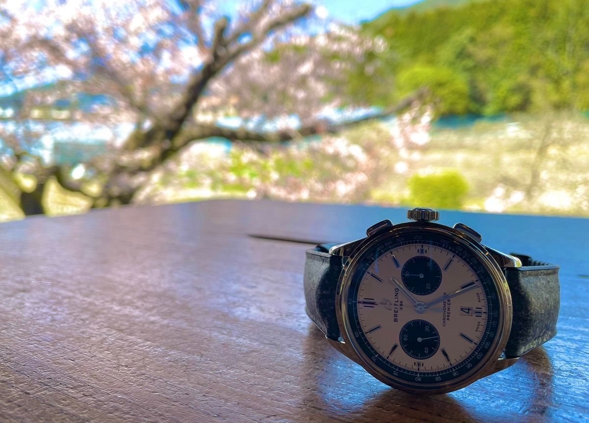 お気に入りの時計(ブライトリング:プレミエ)と一緒に桜を撮りましたが、全く桜にピントが合ってませんでした…笑