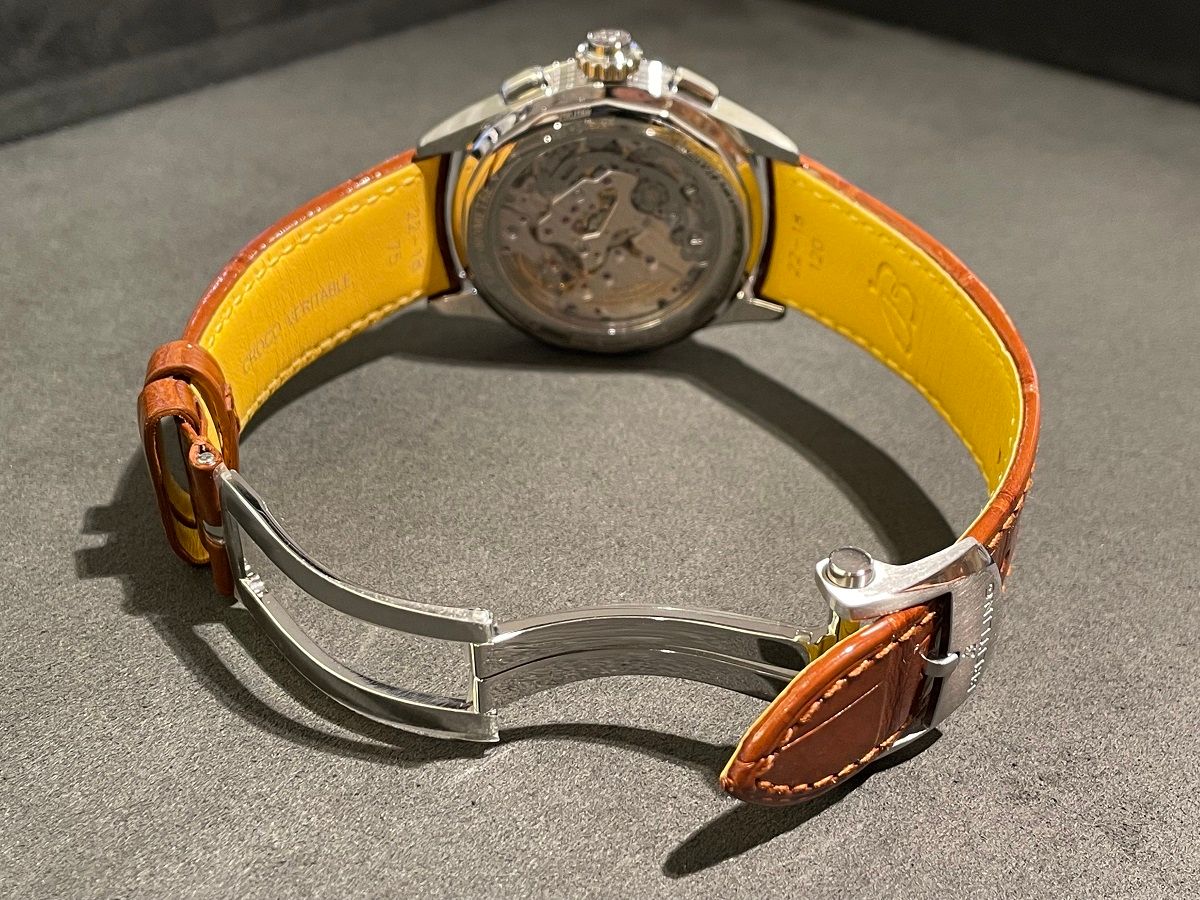 落ち着きのある深いブルーの文字盤に、ブラウンのアリゲーターという組み合わせもお洒落です。