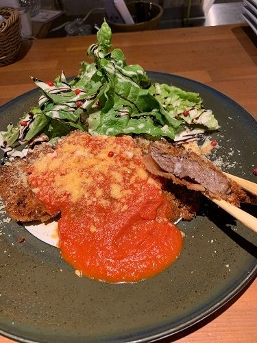 牛カツにトマトソースとチーズが掛かった料理で、和洋折衷では無く「和伊折衷」と言った感じでとても美味しかったです!