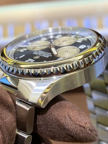 ベゼルもポインター付きの両方向回転ベゼル(回転計算尺)になっており、パイロットウォッチの要素も充分に満たす機能も付いております。