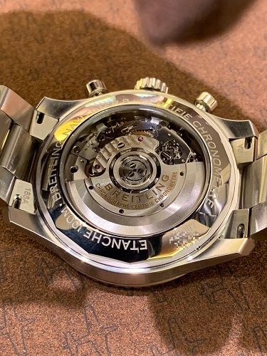 ムーブメントは自社キャリバーB01搭載ですので、安心の5年内部保証と70時間のロングパワーリザーブ、他のブランドではあまり見られない「日付変更禁止時間帯」が無い事などブライトリングが自信を持って発表したムーブメントですので、中身もかなりハイスペックです!!