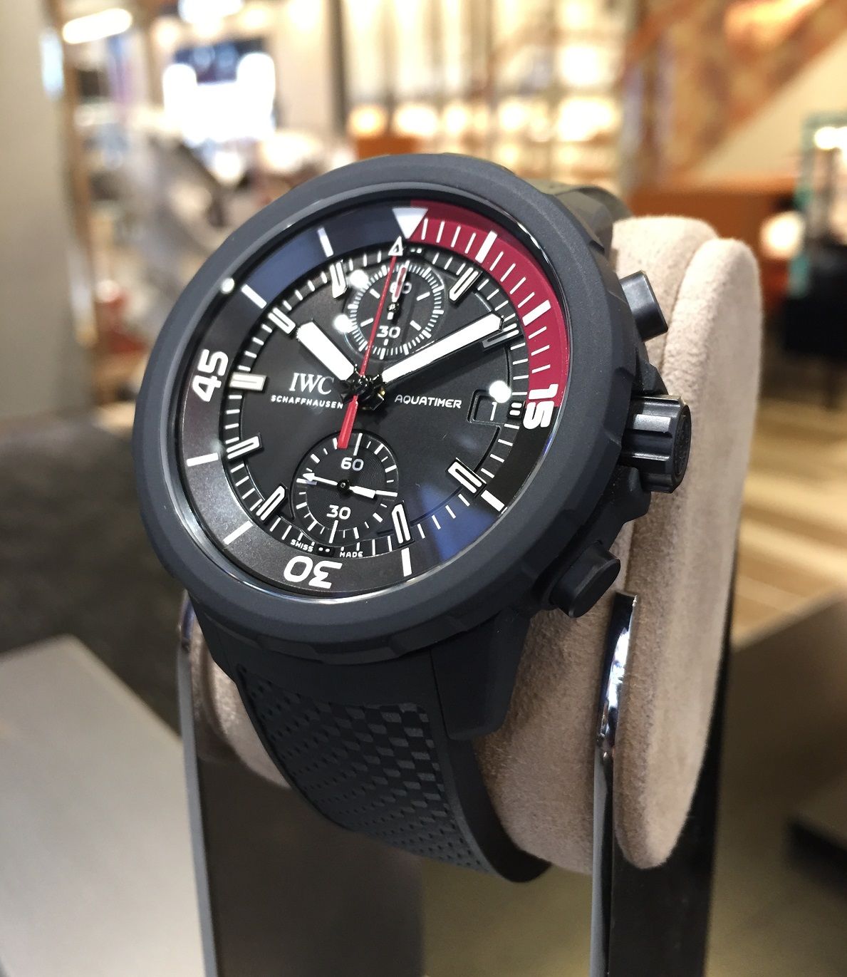 黒を基調とした落ち着きのある全体に、「赤」のクロノグラフ針など差し色がクールなIWCの限定ダイバーズウォッチです!!