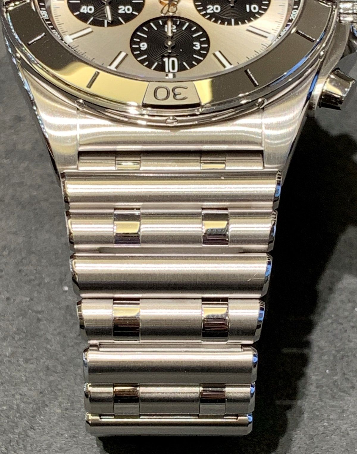 金属ブレス仕様がメインになりますが、以前のクロノマットで人気の高かった5連ブレスからルーローブレスレットに変わり、ブライトリングの歴史と共に、丸みのあるブレスレットは装着感も向上しております‼