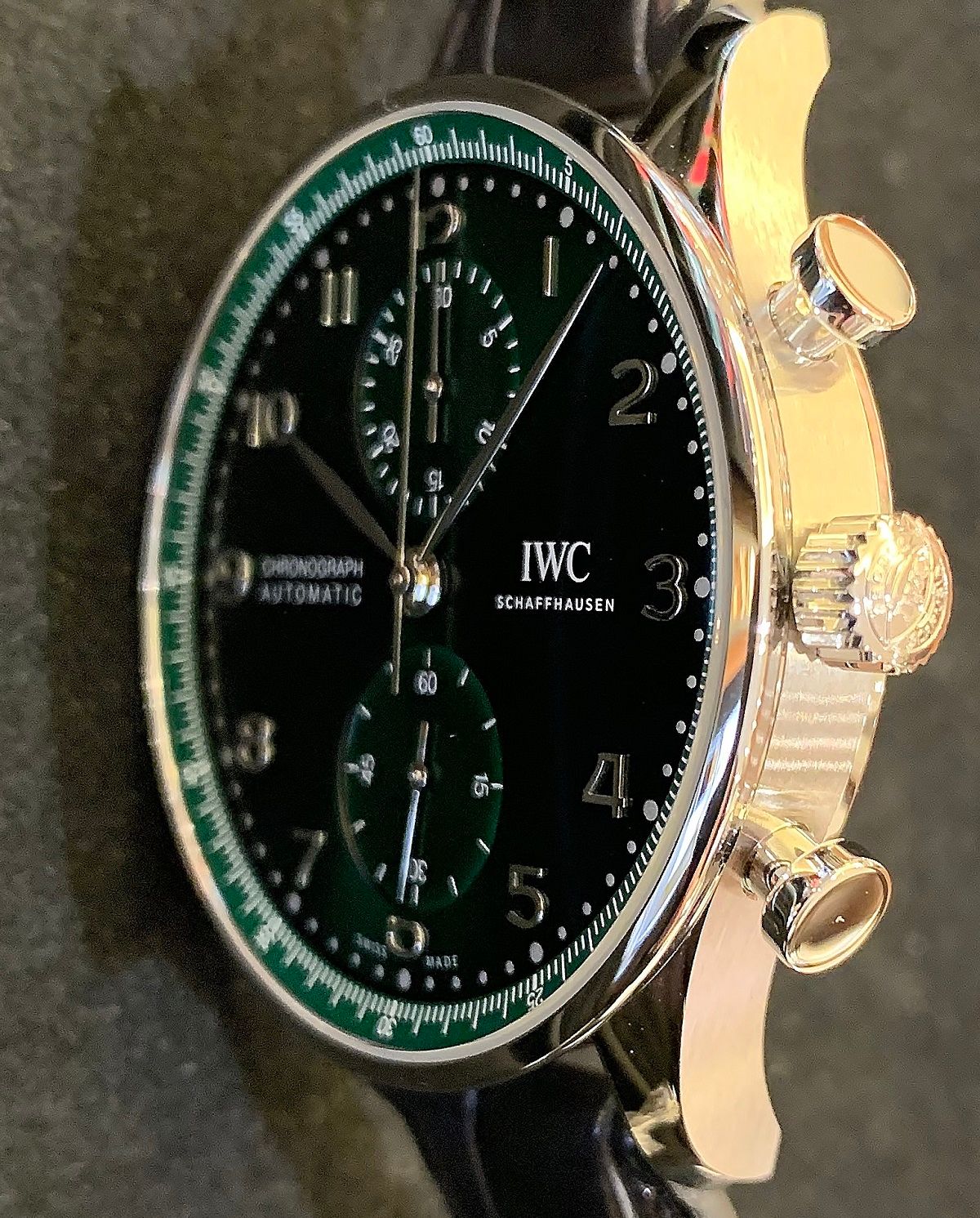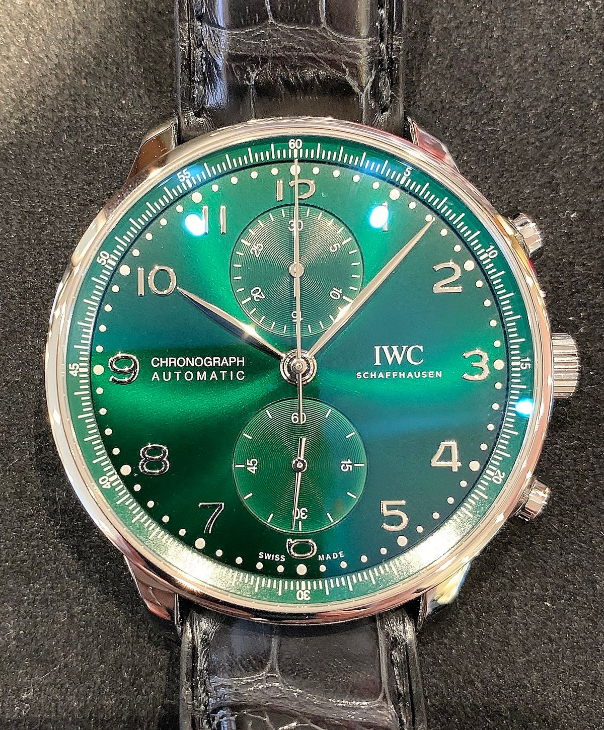 IWCは、今年トレンドになる以前に、このポルトギーゼクロノグラフにグリーン文字盤を載せて発表!!