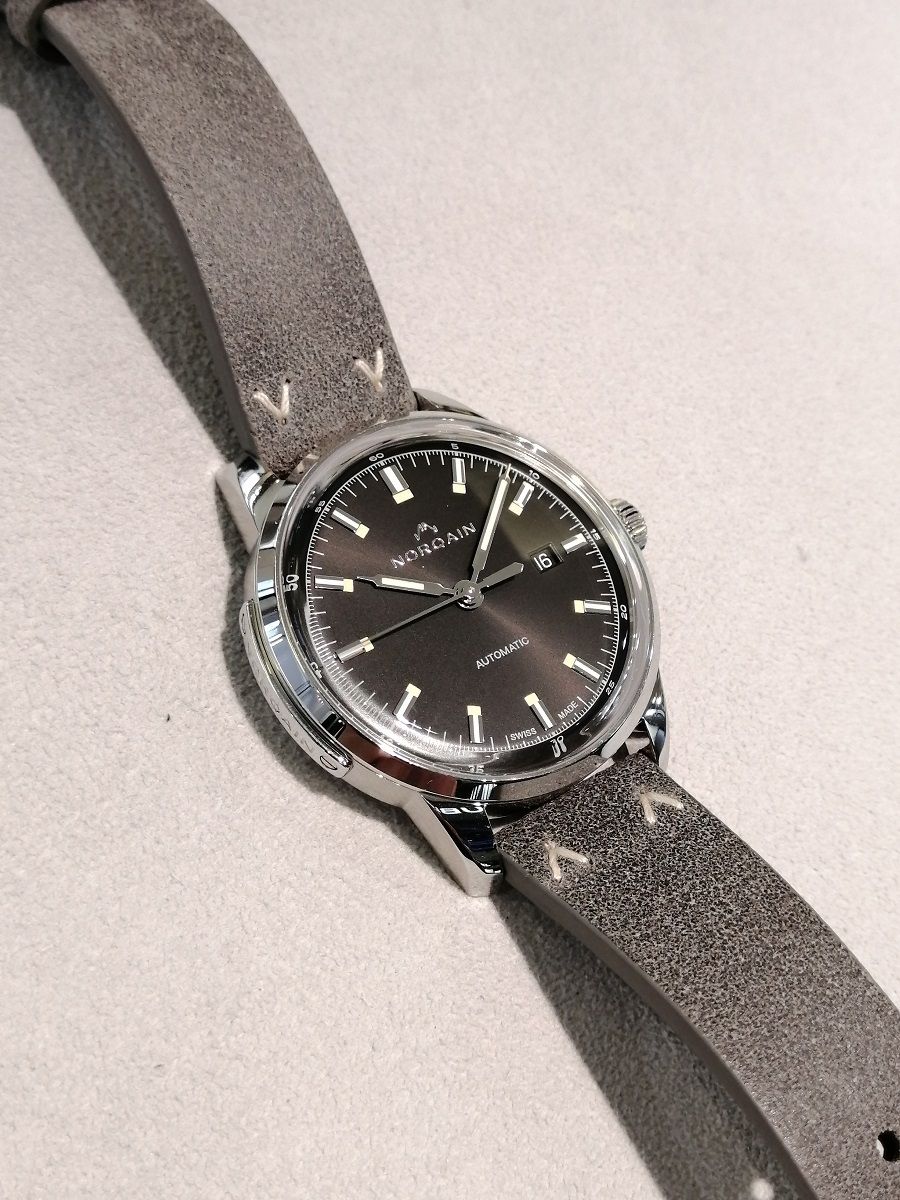 モデル名の通り、1960年代に製造されたスイス時計に敬意を表したアンティークなデザインです。バンドもアンティーク仕上げが良い味を更に出していますね。しかもノルケインステッチと呼ばれる、アルプスの頂きを模したステッチがポイント!