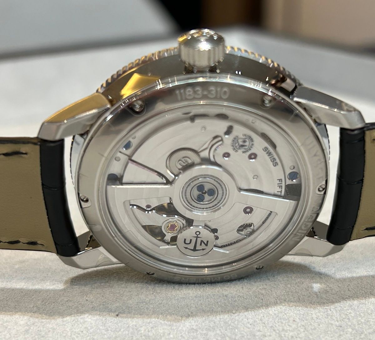 【UN】のロゴが入ったムーブメントが覗いていただけます。