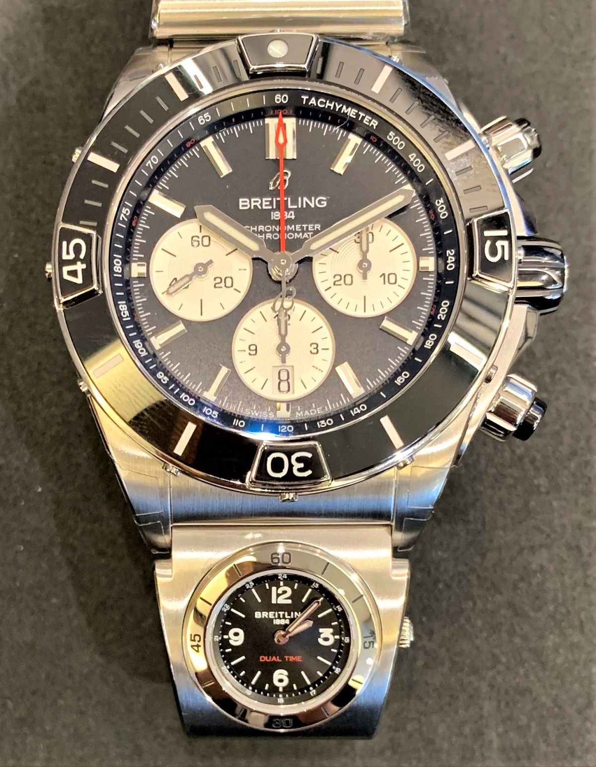 メインの時計は、ブライトリングの自社製造ムーブメントB01が搭載され、UTCモジュールには電池が搭載されています‼