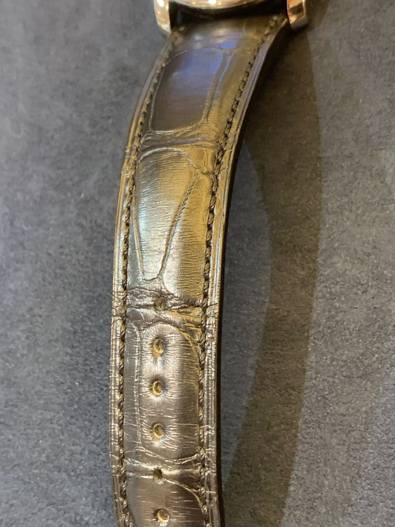 ストラップの素材はアリゲーターレザーで作られています。革が柔らかいので着けやすいです。