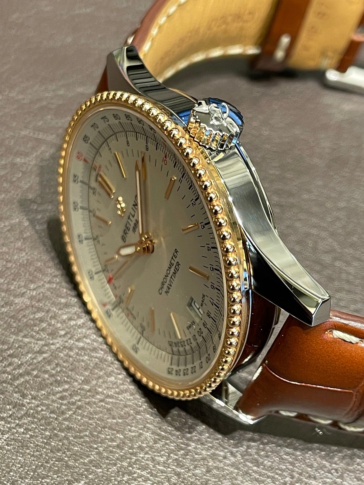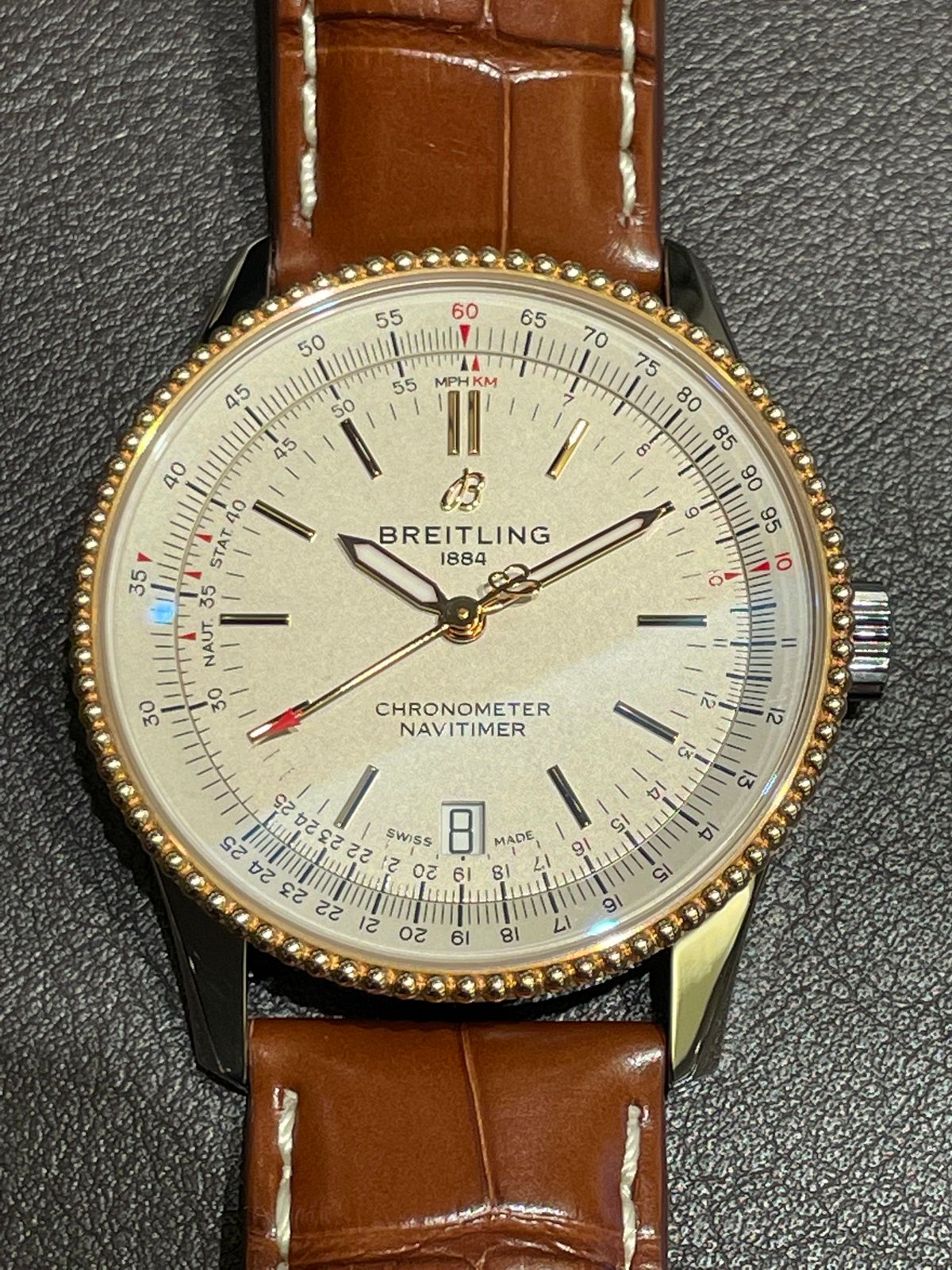 1952年の登場以降、現在に至るまで圧倒的な人気を誇るナビタイマーシリーズですが、こちらは2018年に発表された3針タイプのエレガントなモデルです!
