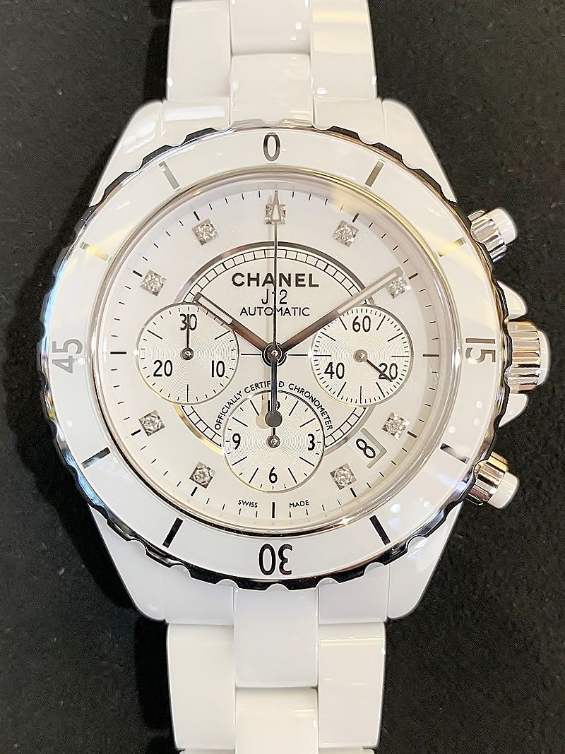 自動巻きクロノグラフ(クロノメーター認定)で、文字盤には9石のダイヤモンドを配し、全体を白とシルバーでまとめ、限られた色彩で視認性と高級感も合わせ持つ、J12クロノグラフと言えば、このモデル!!