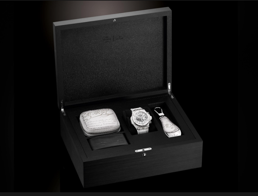ウブロとベルルッティのロゴがあしらわれた、トラベルポーチとシューホーンキーリングが