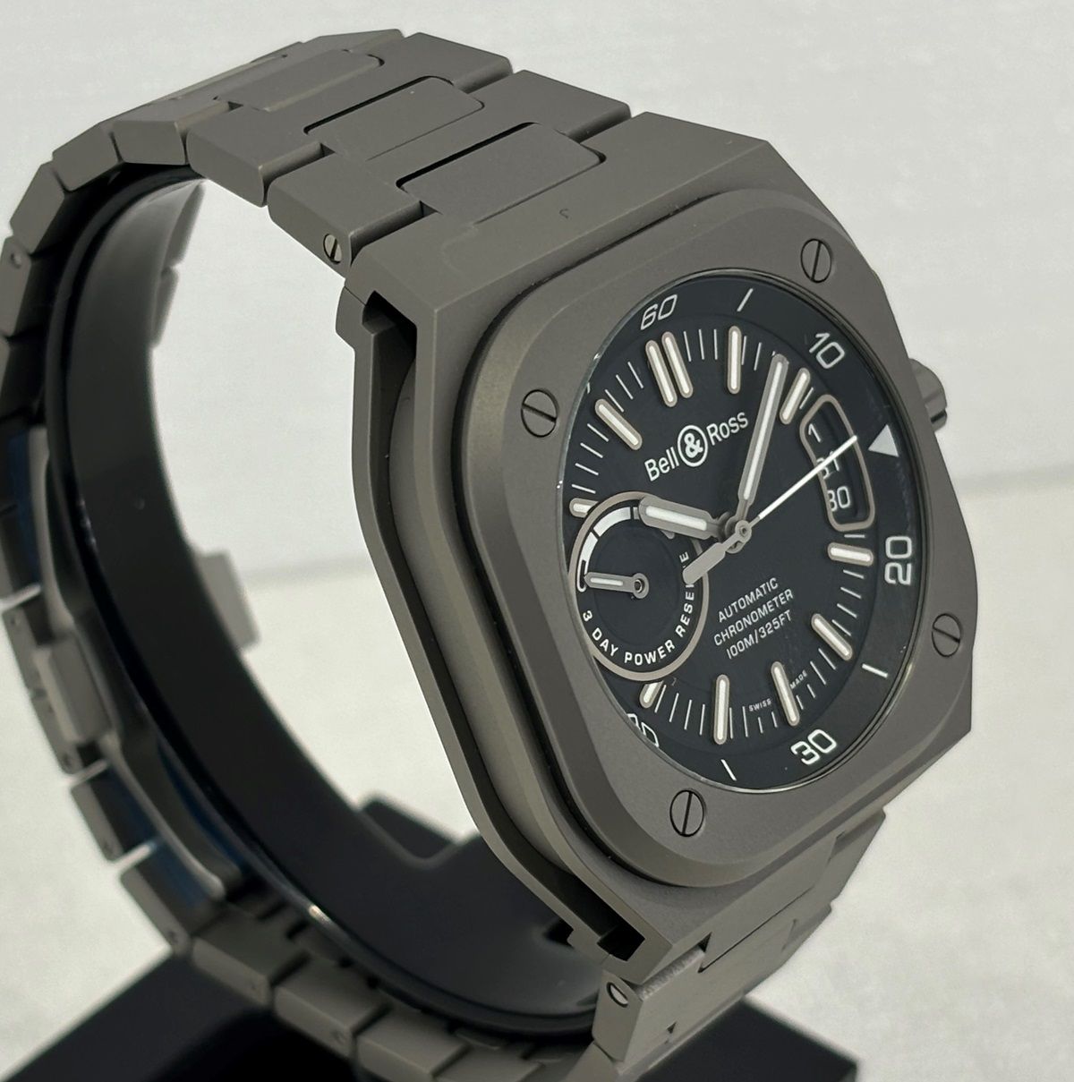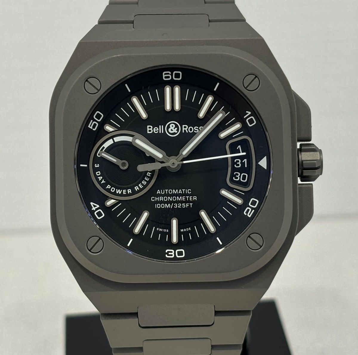 BR-X5はBR05シリーズの最上位モデルとして設定されており、9時位置のパワーリザーブインジケーターと3時位置の日付表示が特徴的な時計です。