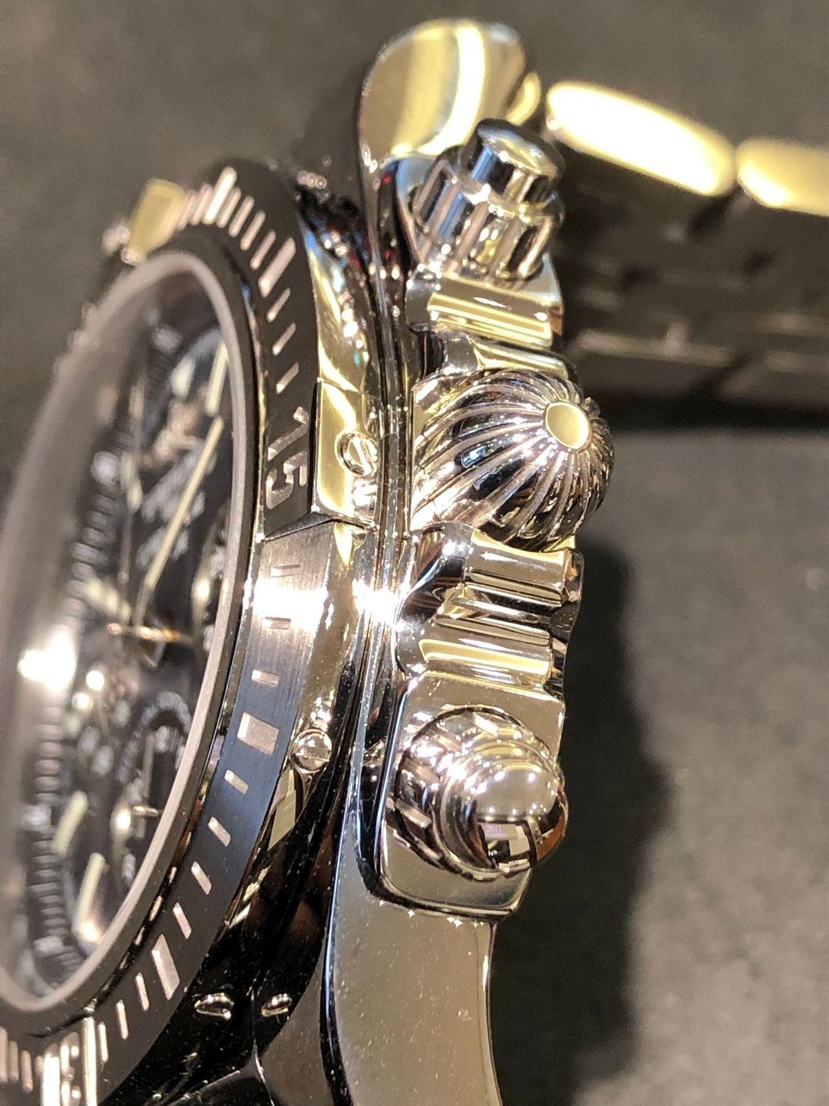 しかし、サテン仕上げの逆回転防止ベゼル、クロノグラフ用ロック式プッシュボタン、4時5時間の日付表示などはこのモデルでラストの仕様です!!