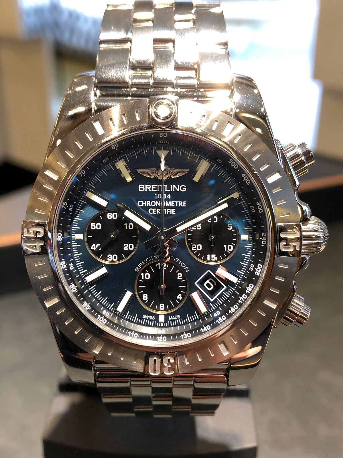 仕様:自社製自動巻きクロノグラフムーブメント(キャリバーB01)、70時間パワーリザーブ、日付変更禁止時間帯無し、日付表示、内部保証5年間、500m防水。