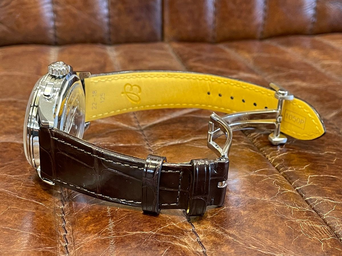 ストラップは落ち着きのあるブラウンのアリゲーターですが、裏面はイエローで着け外しの際チラッと見えるのがまたお洒落です!