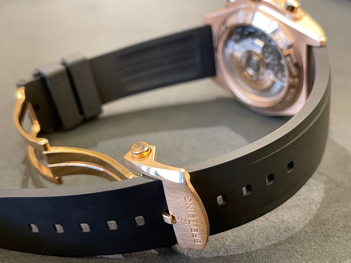 このケースサイズのクロノマットにはルーローブレスレットのイメージがありますが、こちらのモデルにはシンプルなブラックのラバーを組み合わせています。