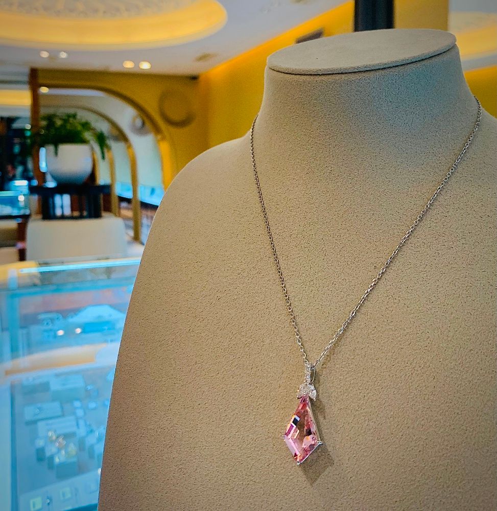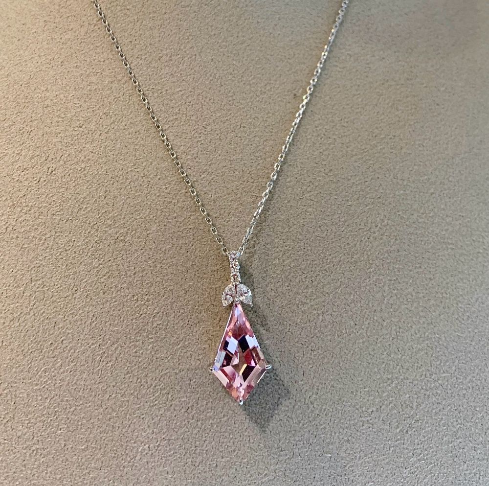 モルガナイト 7.7ct、1ミリ単位で調節可能なPTのチェーンは