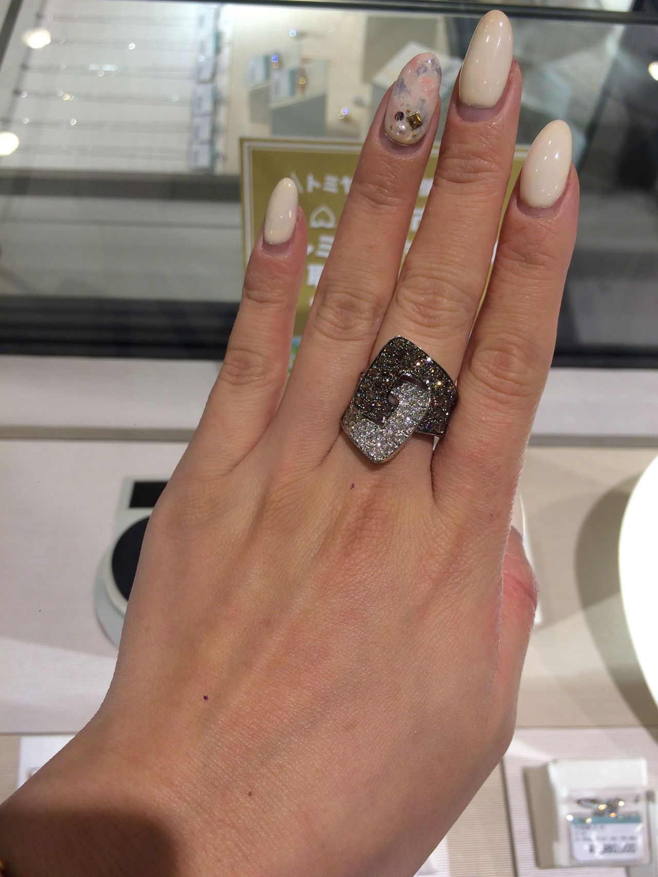 ブラウンダイヤとホワイトダイヤを使ったリングでコンビになっており、遊び心がありながら、ちゃんと存在感もある。