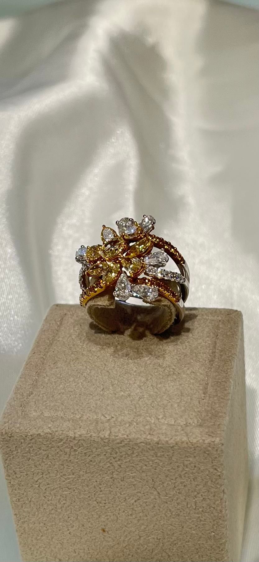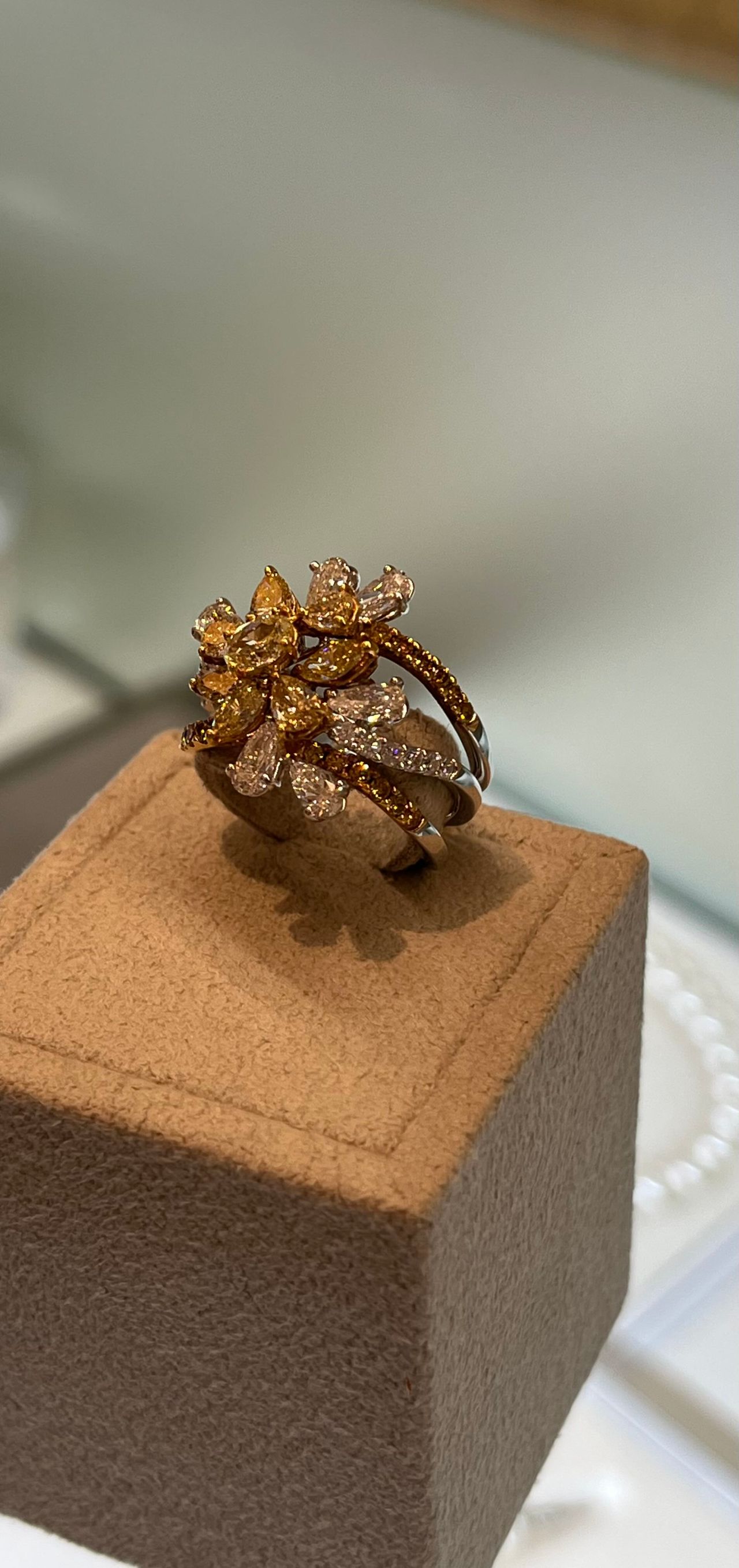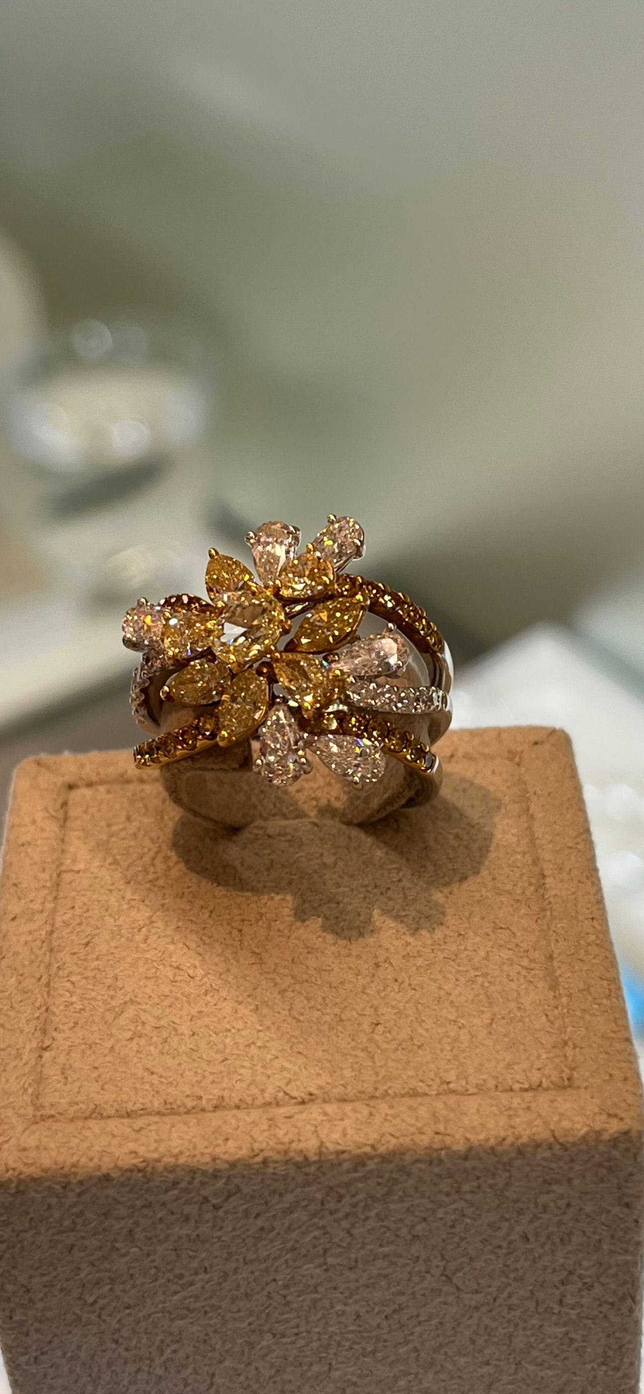 イエローのダイヤモンドを使い、複雑で繊細なセッティングとなっています。
