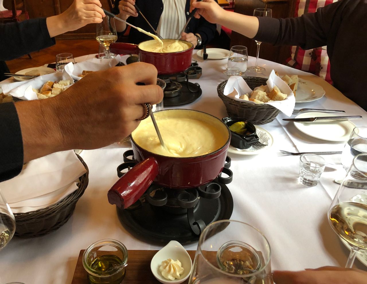 スイスのチーズはクセがなく食べやすかったです。チーズフォンデュには白ワインが。現地の方によると、消化を助けてくれるそうです。