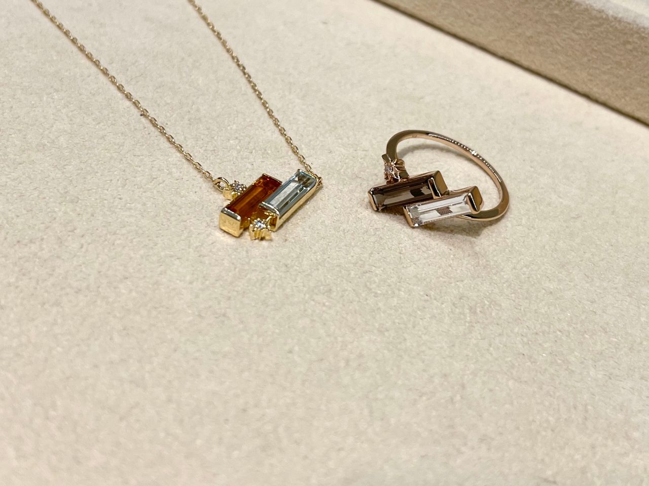 店頭にあるネックレスは、「シトリン」と「スカイブルートパーズ」の組み合わせ。