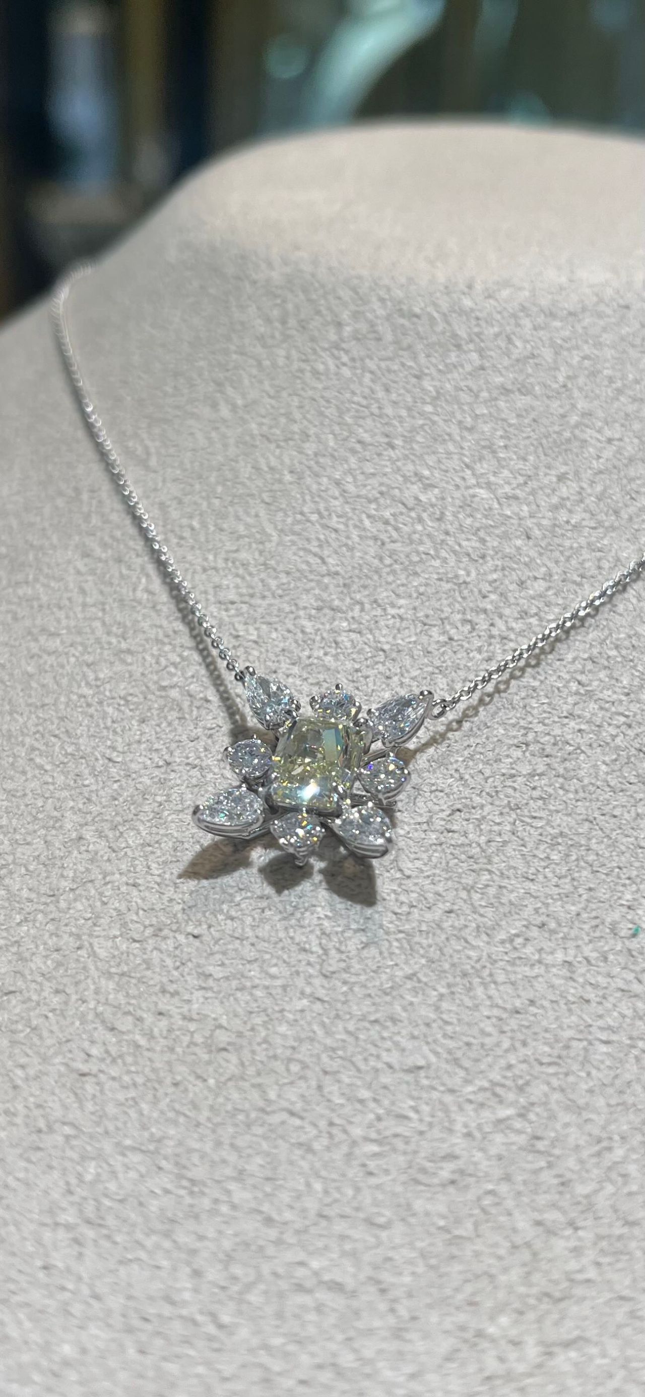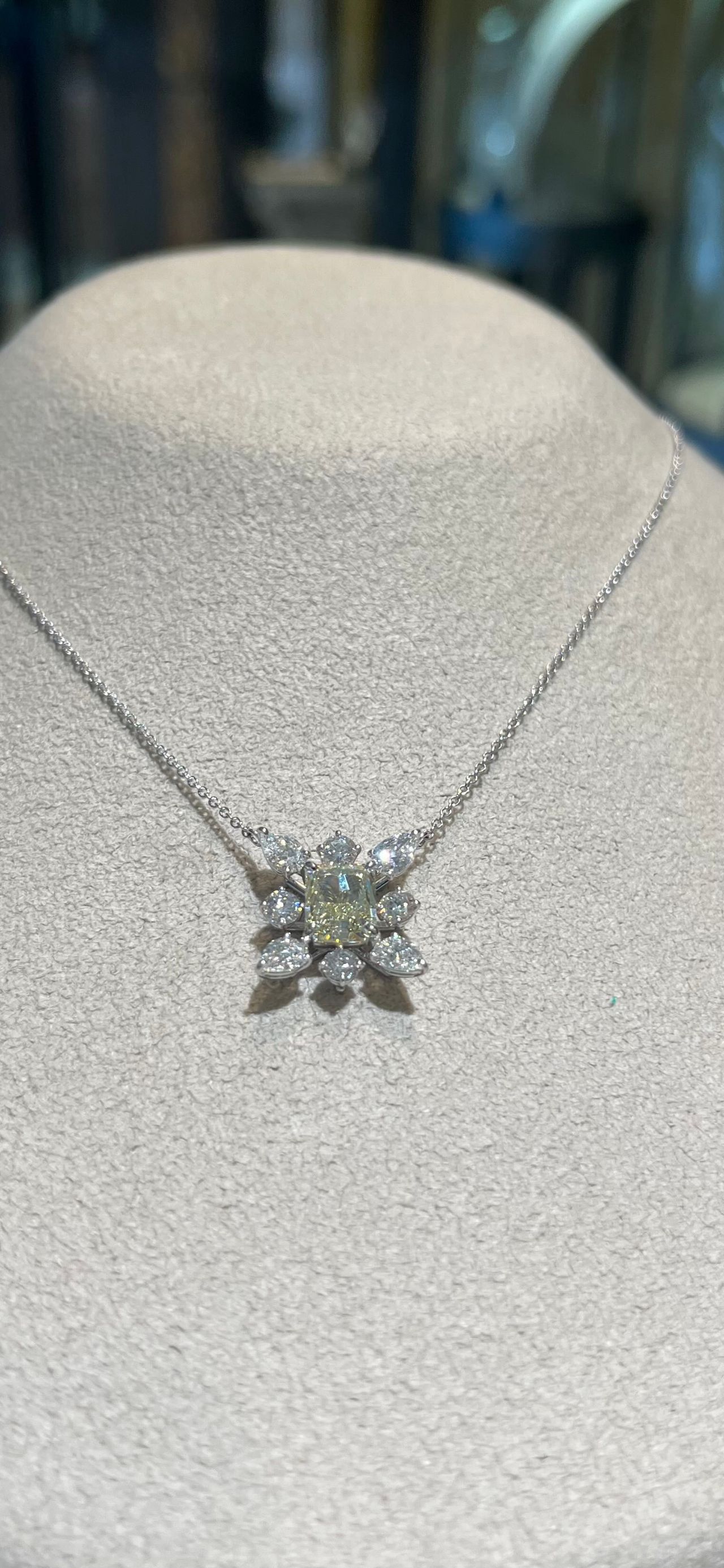 中心に配置されたイエローのダイヤモンドと、シンメトリーにセッティングされたダイヤモンドが非常に美しいデザインです。