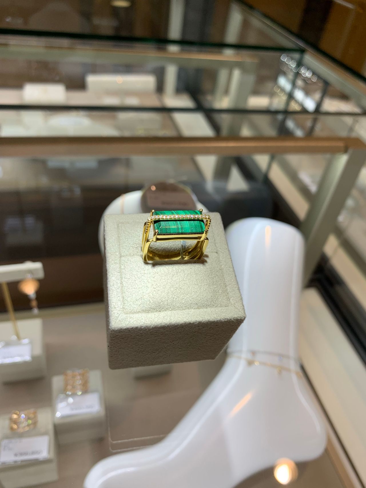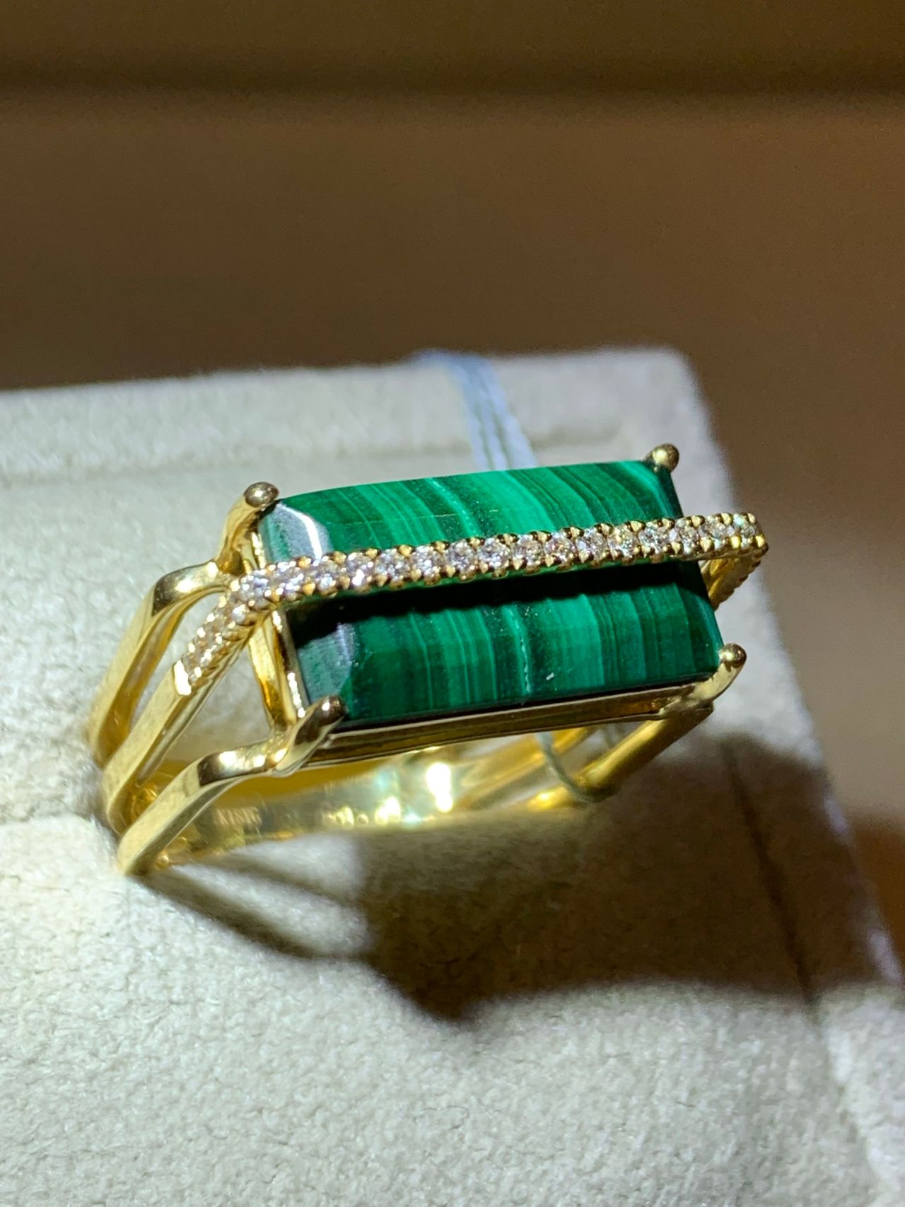 イエローゴールドとマラカイトのグリーンは相性バッチリ!配置されたダイヤモンドがより一層、色味を引き立てています。