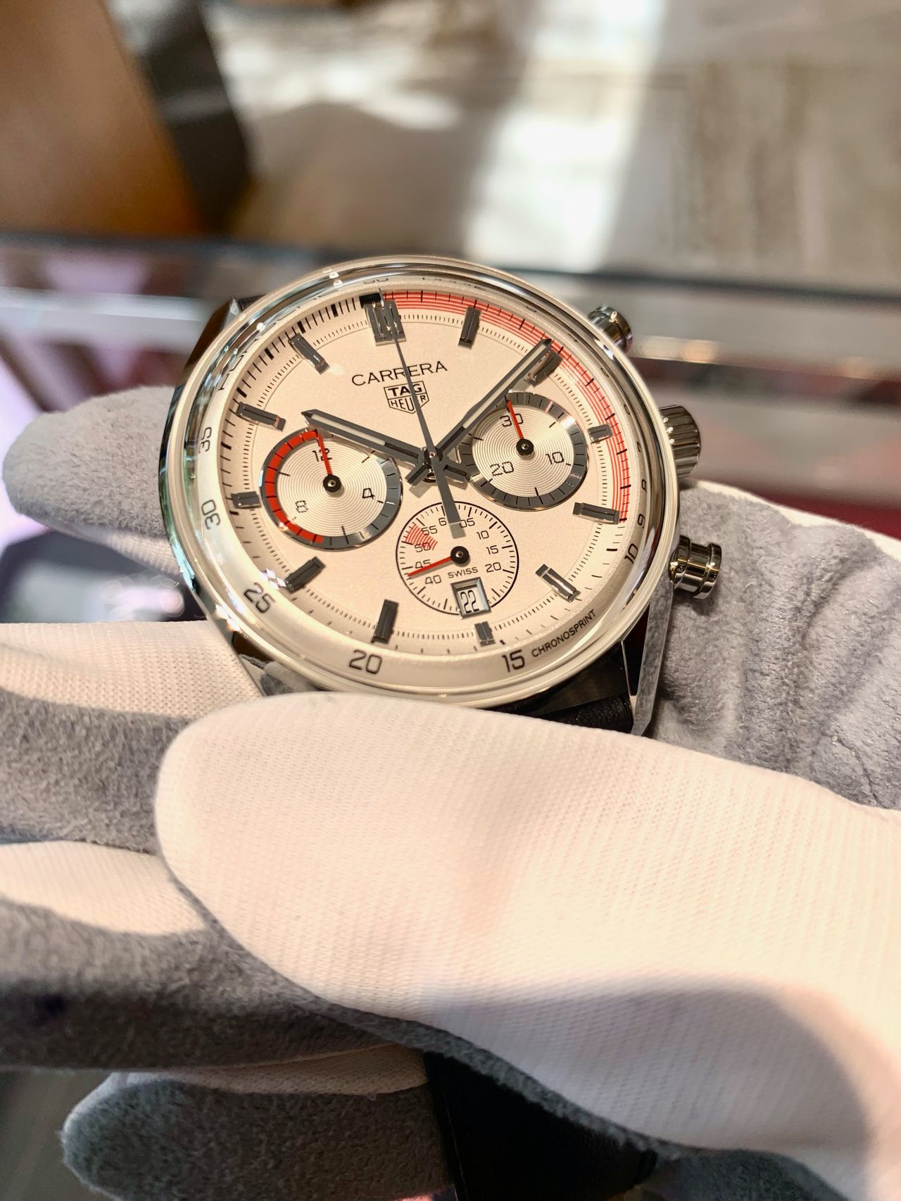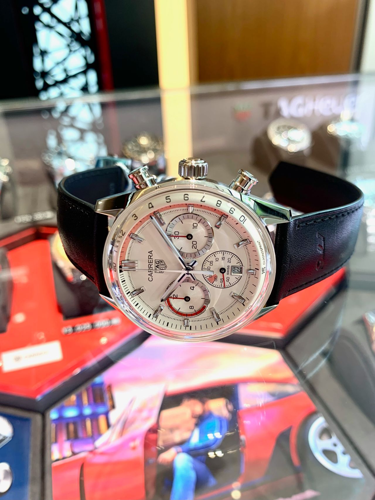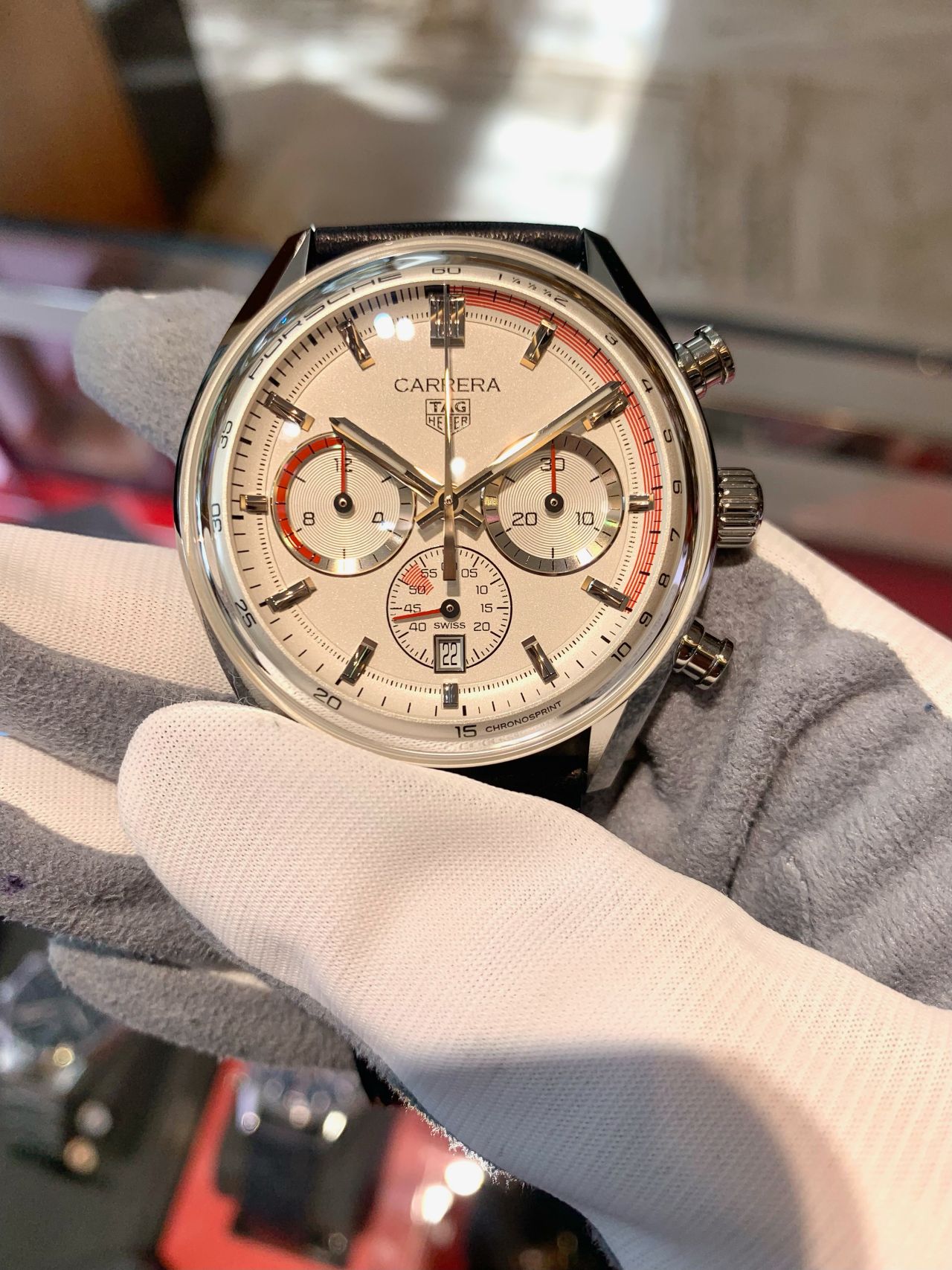 レッドのハイライトが全体に施された、輝くシルバーのカレラは