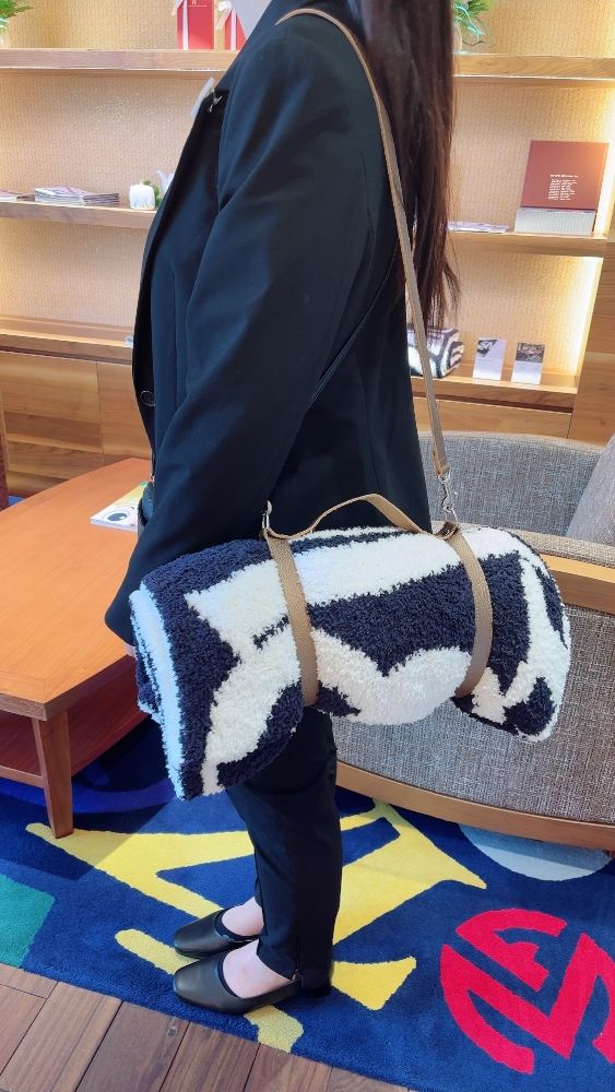 持ち運びも簡単で、このようにブランケットは肩にかける事も出来ます。
