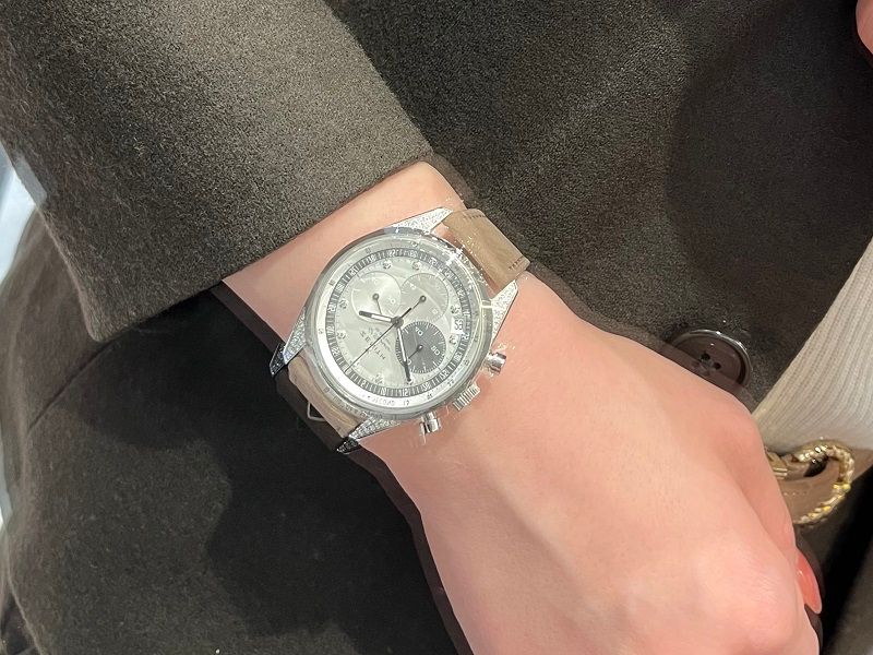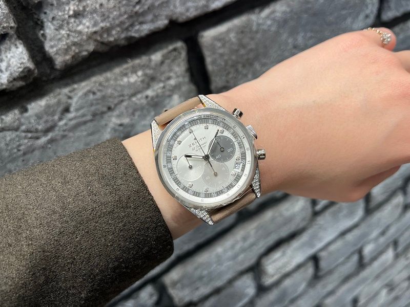 38mmのステンレススチールケースで、ラグの部分とインデックスにダイヤモンドがセッティングされているので、