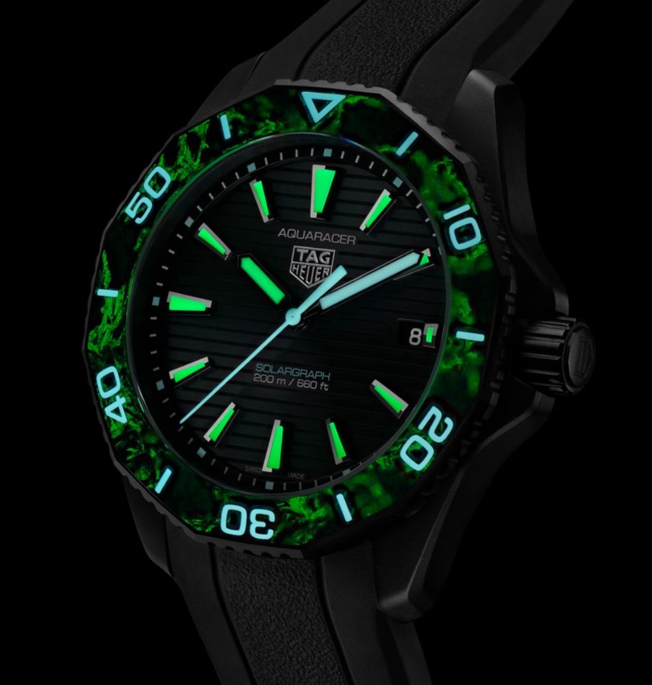 ベゼルインサートにはカーボンと夜光塗料の融合により、