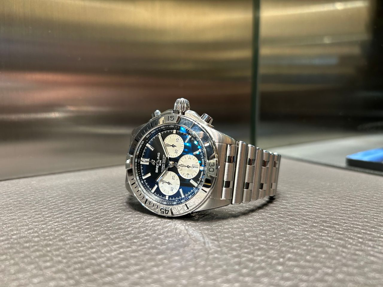 こちらのモデルはクロノグラフの針も文字盤に合わせた