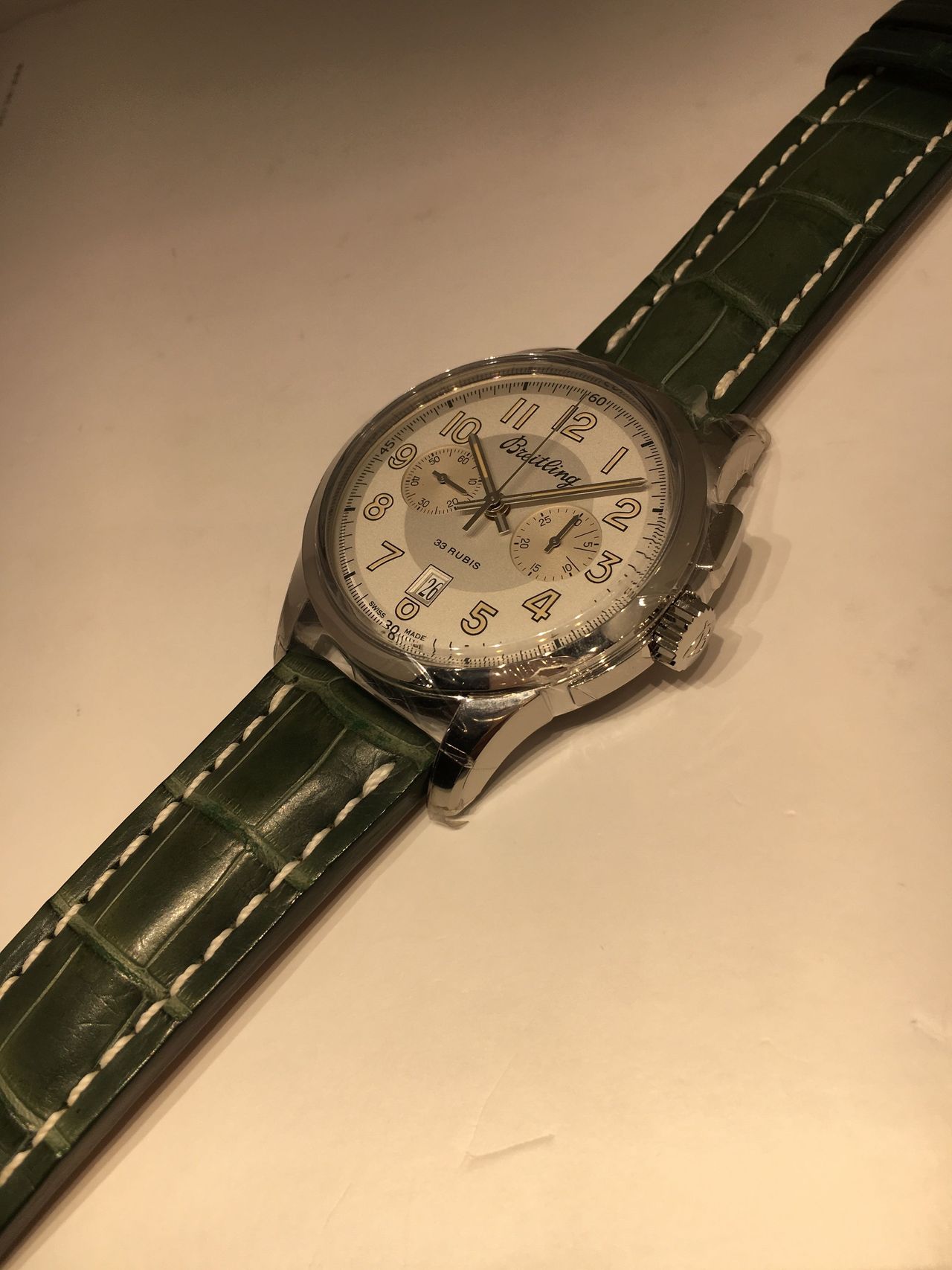 味のあるデザインに、グリーンのクロコストラップが相性抜群(^^)!