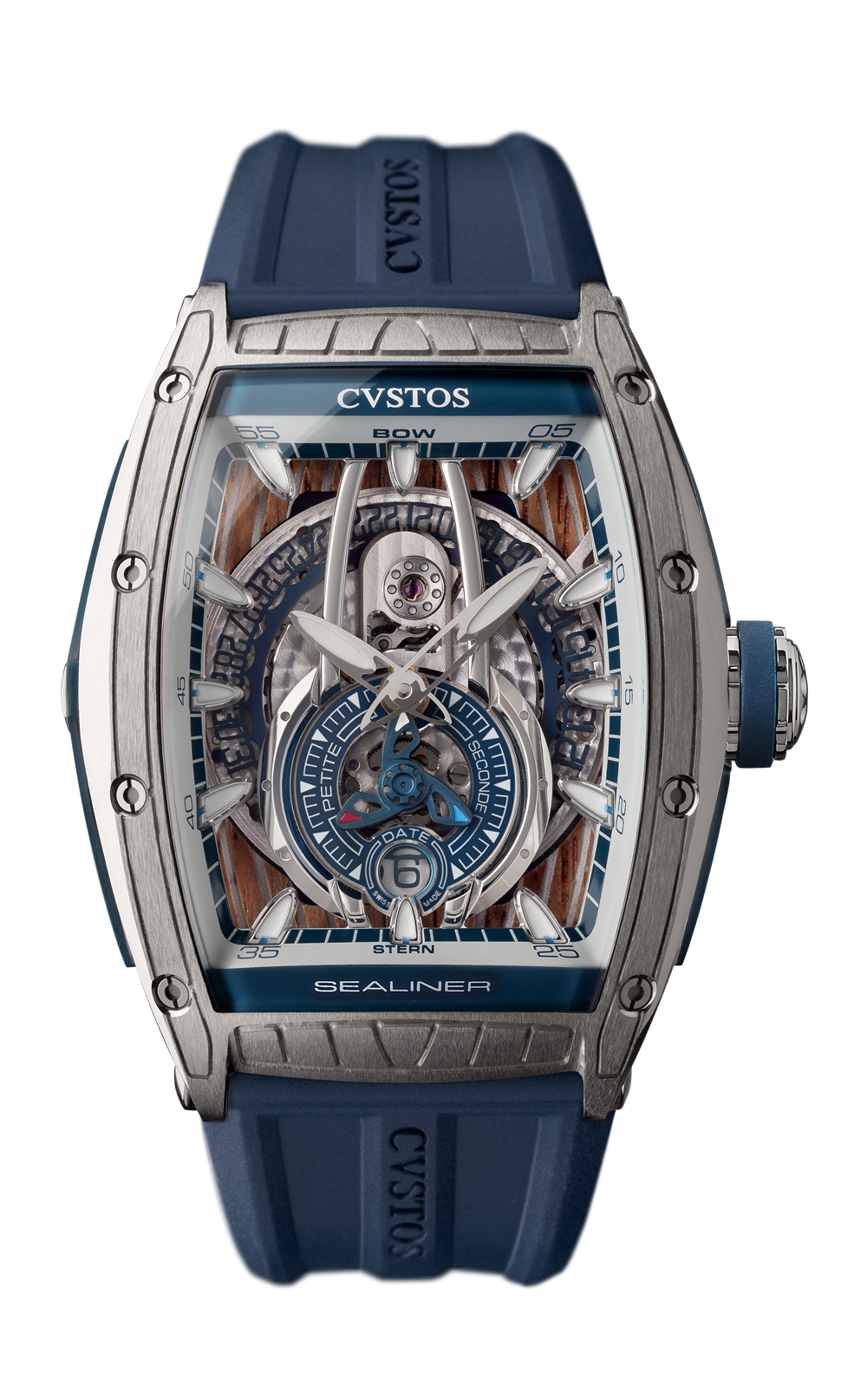 「チャレンジ シーライナー P-S オートマティック」は航海から生まれた美学に着想を得て、透明のダイアルとシースルーバックを採用し、ムーブメントの見事な機構を楽しむことができる、視認性の高いデザインに仕上げられています。6時位置にあるスモールセコンドには、船のスクリューを想起させる羽根車が取り付けられ、機能性がデザインにおいても表現されています。