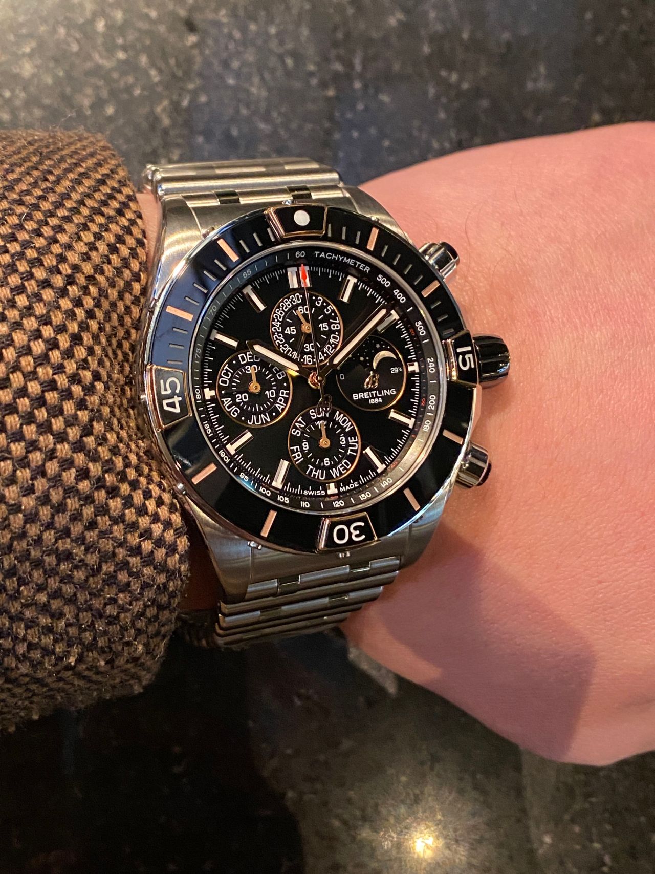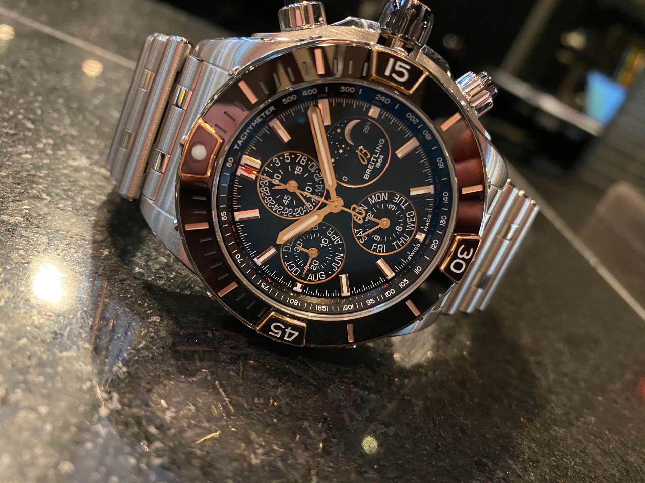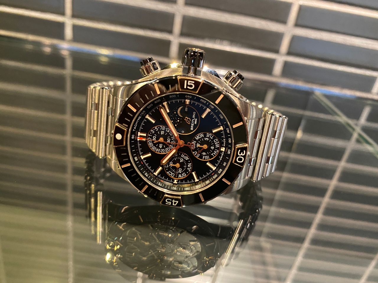 月、曜日、日付、月齢が表示された文字盤にブライトリングの代名詞でもあるクロノグラフ機構を搭載された超複雑モデル。