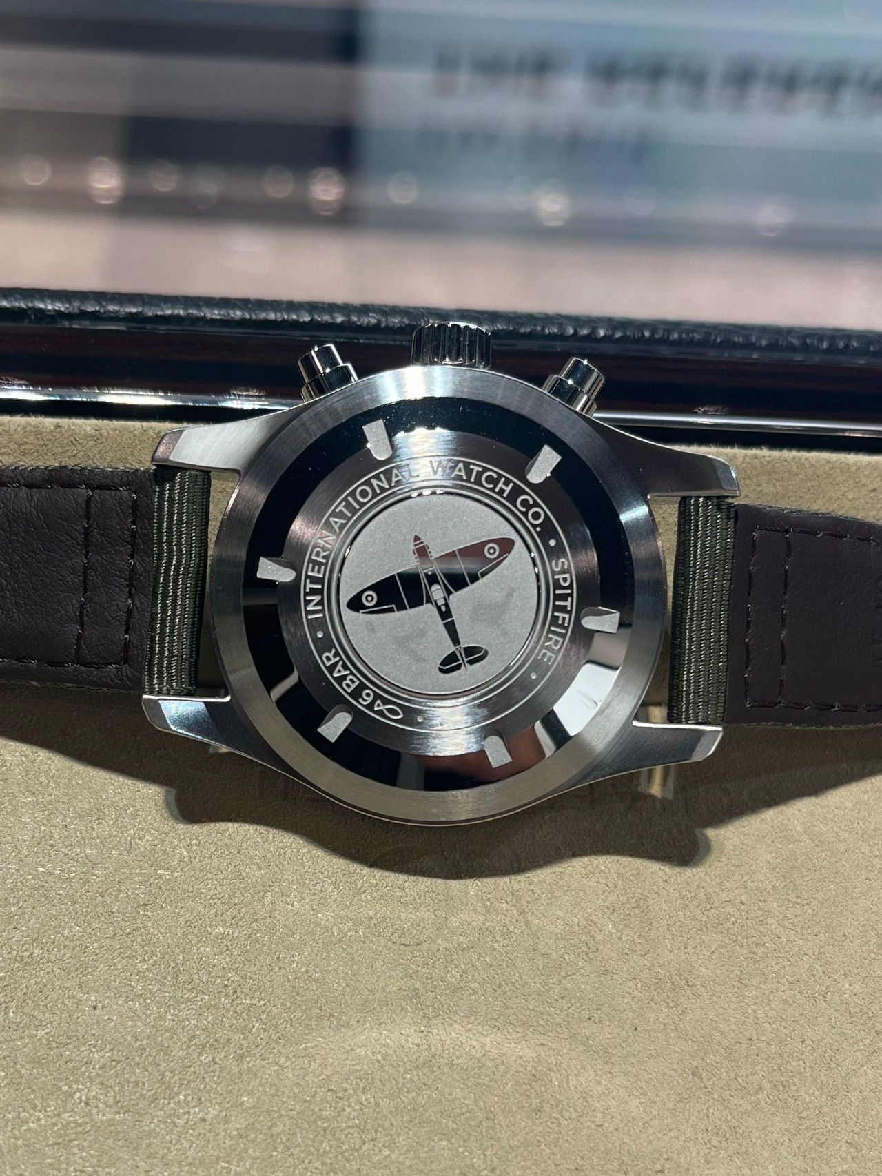 ステンレス製ケース、ブラック文字盤、グリーンの布製ストラップを備えており裏蓋にはスピットファイア号をあしらっている特別仕様でミリタリー感が万歳です!