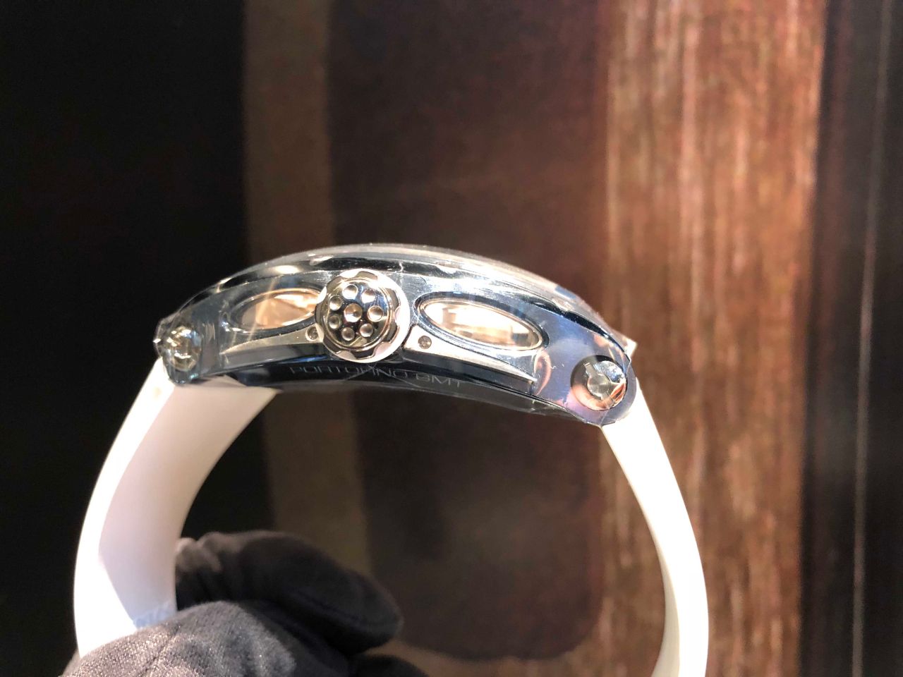 ブルースチールケースの光沢に、ムーブメントのゴールドが