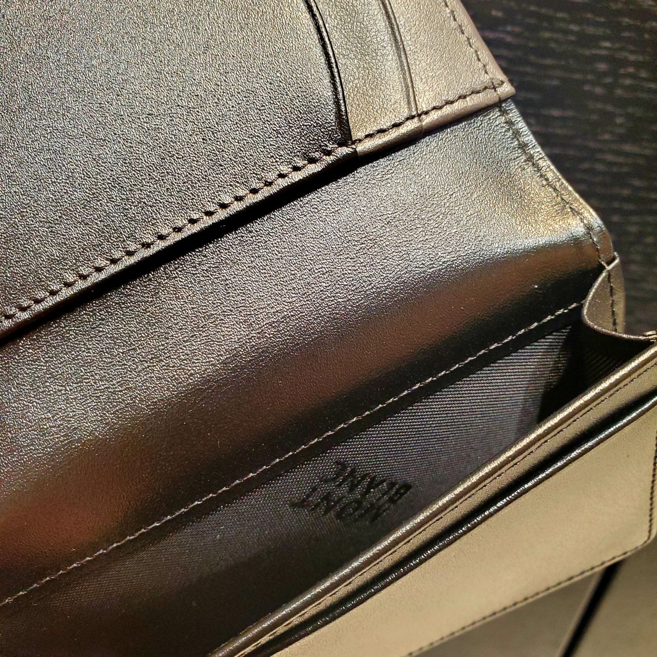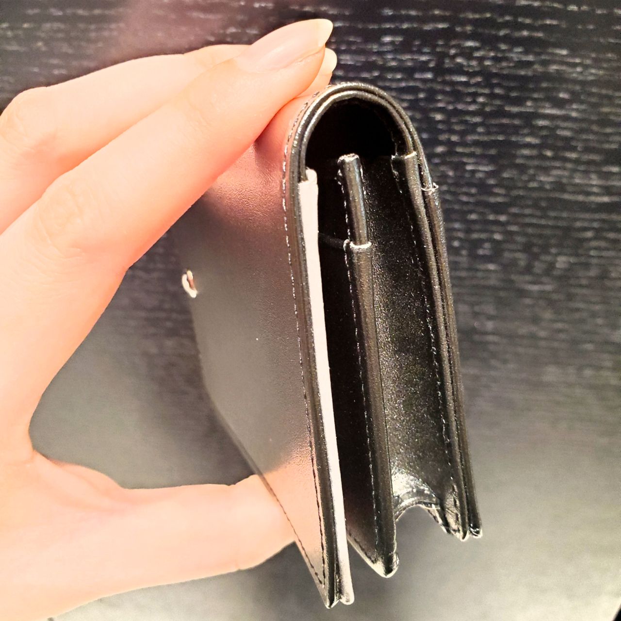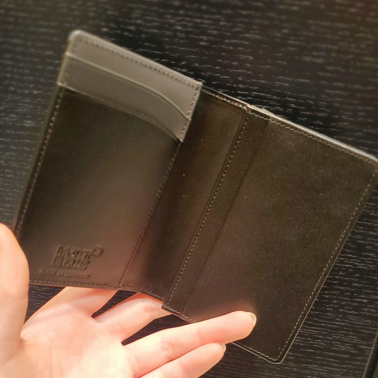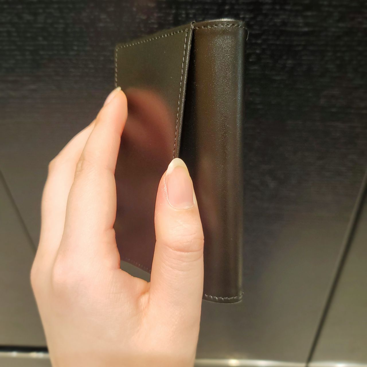 外側はブラックレザー、内側のクレジットカードスロットはグレーの色合いが特徴で、