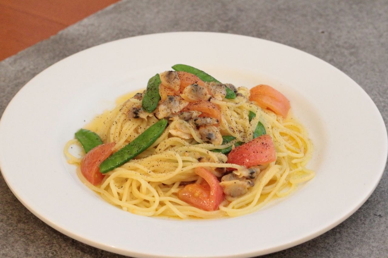 アサリの出汁が効いた、オイルでもきぬさやとフレッシュトマトがさわやかな風味
