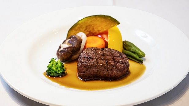 岡山県産和牛のうまみたっぷり、肉厚なステーキに