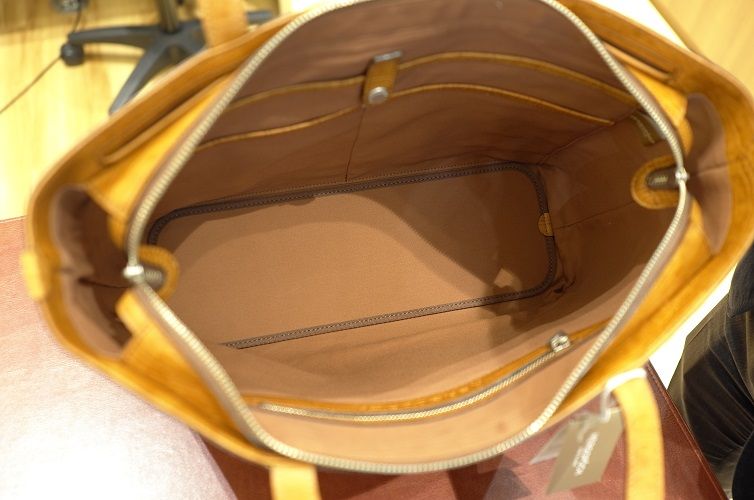 持ち手の内側には大振りのあおりポケットを配し機能も十分です。