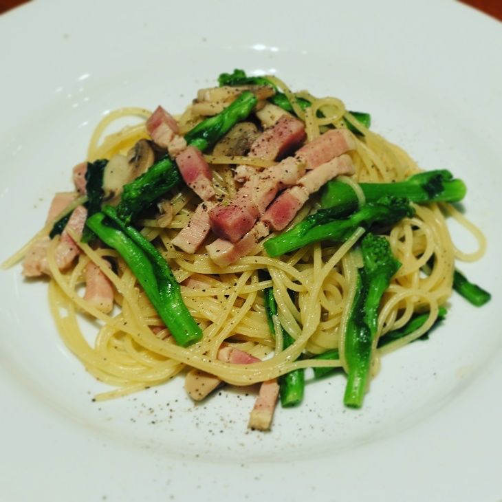春の味覚 菜の花とベーコンで仕上げた、定番のオイルパスタ。