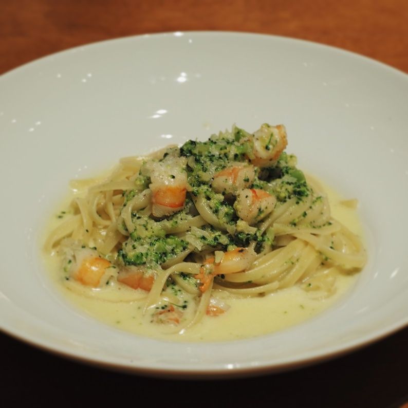 プリプリとした食感のエビとブロッコリーを濃厚なクリームソースで仕上げました。