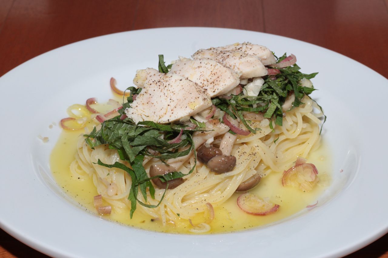 オイルとゆず胡椒を合わせ、大葉・名荷で夏らしく爽やかな風味のパスタです♪