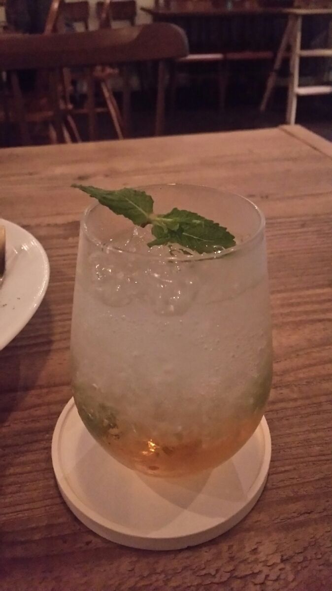 モヒートはミントと柑橘のきりりとした爽快な辛口でしたが、下に沈めてあるピーチコンポートが混ざると少し甘めのフルーツカクテルになりました。