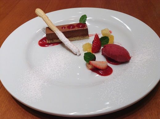 コーヒーとチョコレートのムースと苺の自家製ソルベです