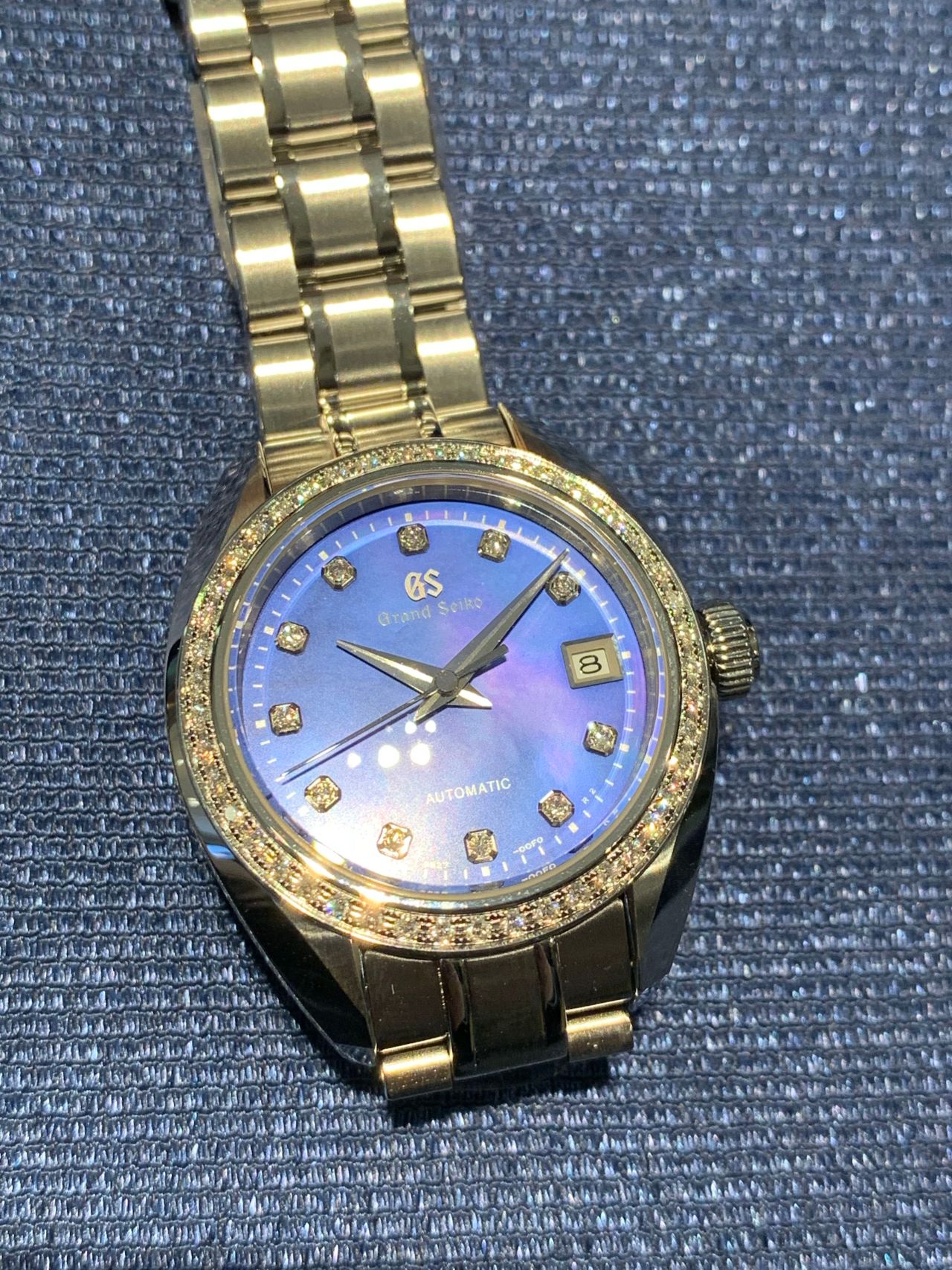(難波)グランドセイコーブルーとも言われますが、ブランドのイメージカラーの紺色の文字盤と縁取りの45石のダイヤモンドと11石のインデックスダイヤが美しく女性の腕元で輝きます!ビジネスだけで無くパーティーシーンにも合う素敵な時計ですので、長くご使用頂けます!